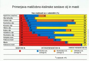 Po sestavi je zaradi zelo ugodnega razmerja med omega 6 in omega 3 maščobnimi kislinami najbolj primerno olje oljne ogrščice oziroma repično olje. Pri olju naj bo razmerje med omega 6 in omega 3 manj kot 5:1. Pri ogrščičnem olju je to razmerje 2:1 (n6:n3), pri sončničnem olju pa je razmerje neugodno in sicer kar 136:1 (n6:n3). Ogrščično olje vsebuje tudi zelo malo nasičenih maščobnih kislin in veliko enkrat nenasičenih maščobnih kislin. Graf primerjave maščobno kislinske sestave olj je preveden po: www.canolacouncil.org
