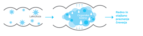 Laktuloza je za človekove prebavne encime neprebavljiva. Šele v debelem črevesu jo začne mikrobiota razgrajevati v organske kisline (mlečna, ocetna, propionska, butirična). Te v debelem črevesu zadržujejo vodo in tako povečajo volumen črevesne vsebine. Povečan tlak deluje na receptorje raztega v črevesu in na fiziološki način sproži odvajanje [12].